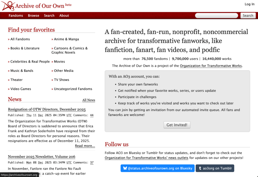 Overall I understand that this website is more geared toward people that have been recommended the site versus a site like Wattpad, that has a more fly-catching type of appeal to people that are new to it. I’d say AO3 has a more humble or quaint aesthetic due to funding differences, it doesn’t run ads (Wattpad does and they made it so you have to pay to access certain features, but don’t quote me on that. I stopped using Wattpad a little before they started getting greedy with their stuff). AO3 is very to the point, you can browse through the ‘Fandoms’ if you don’t know what characters you want to read about, but the site doesn’t actively spotlight or promote reading any of the works uploaded on their site. It’s an effective site in the sense that you’re getting what you came for, whether it be fan art or fanfiction there’s all kinds of imaginative things on there, but it’s up to the viewer to decide if they want to dig around to find something they’d enjoy. Like I mentioned previously, there are adjustments that could be made to attract more readers, or to improve user experience. I don’t love the look, but I like how straightforward it is.