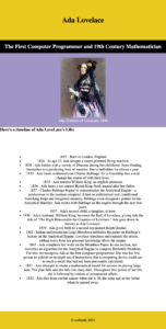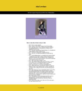 Ada Lovelace Tribute, Visual studio code, HTML, CSS, the assignment was to closely replicate the original version of the tribute using what they taught us about HTML and CSS.